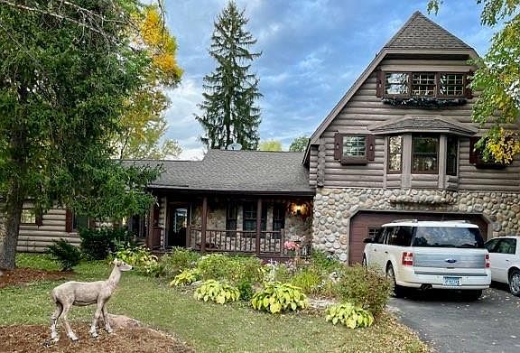 skylights. The original section has two bedrooms, one is large with a vaulted ceiling. Walk out the main floor, oversized sliding glass door, and relax on the deck. One step down, you are in your lush yard. Entire north side of the home is windows to look out onto the lake along with a second story deck. Custom wood carved staircase and large log walls and beams are just a few of the unique characteristics.