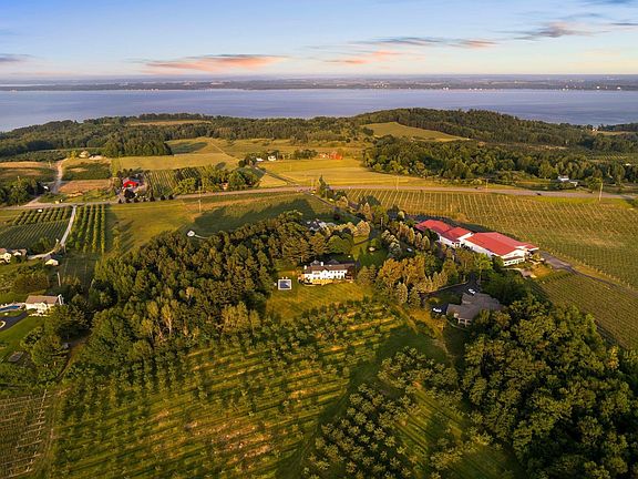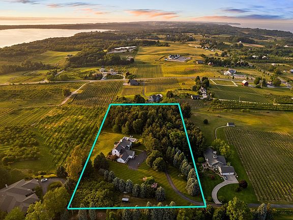 Prepare yourself for a home unlike any other. Nestled aloft the hills of Old Mission Peninsula with unobstructed, sweeping views of West Grand Traverse Bay, this 5 bed/4.5 bath home is truly something special. Designed by acclaimed local architect Ken Richmond, the home blends beauty and function seamlessly with vast cathedral ceilings, light-filled open spaces, and custom woodworking. Adjacent to the foyer is an airy living room bursting with natural light from walls of double-height windows, hosting a stately fireplace focal point. The main level also features a handsome study, a music room with beautiful, gridded beam ceiling, a lovely breakfast nook, and a wet bar. The heart of the home, the island kitchen was designed for a true culinarian with a joy for entertaining. Expansive granite countertops and island contrast against premium appliances and Brazilian Cherry cabinetry. Retrieve a bottle of your favorite vintage from your personal wine cellar and retire to the formal dining room to enjoy a meal with tranquil garden vistas. Rounding out the main level are 2 bathrooms, a mudroom, and a substantial designated laundry. The upper level features 4 sizable guest bedrooms and a hallway bath. The Primary bedroom retreat follows with glorious views, a roomy walk-in closet, and a spa-like en suite bath with jetted tub adorned in Turkish marble. The walk-out lower level of the home hosts the wine cellar, a spacious family game room with a bar and numerous built-ins, the remaining half bath, a home gym, and a relaxing Turkish dry sauna. Exiting into the back courtyard, you are greeted by a capacious in-ground pool and hot tub for ultimate serenity. The attached multi-bay heated garage offers ample space for vehicles and every toy needed to live your Up North lifestyle to its fullest. Just a short drive from downtown TC, this home is situated on 5 breathtaking acres awash in the glow of West Bay’s brilliant sunsets, amidst Old Mission's celebrated wine region!