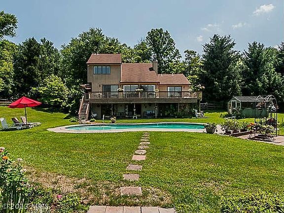 VIEWS! Beautifully maintained 3BR Contemporary home feat. hardwoods, spacious LR w/FP,cath ceil, opens to deck, formal DR w/accent molding, kit w/island & breakfast area.1st floor owners suite w/WIC,FP & cath ceil, private bath w/jacuzzi tub & sep shower. LL rec rm w/wood stove, full bath, opens to patio. Excellent-landscaped lawn & gardens, in-ground pool, gazebo, green house, fenced in yard.