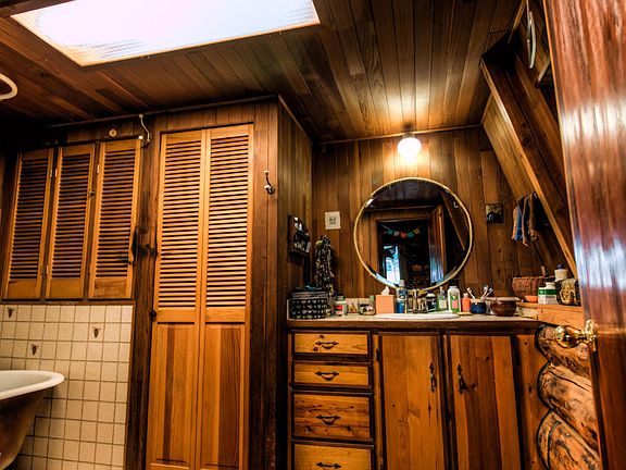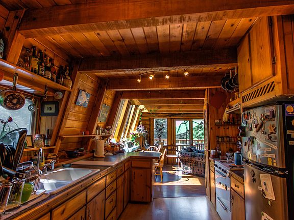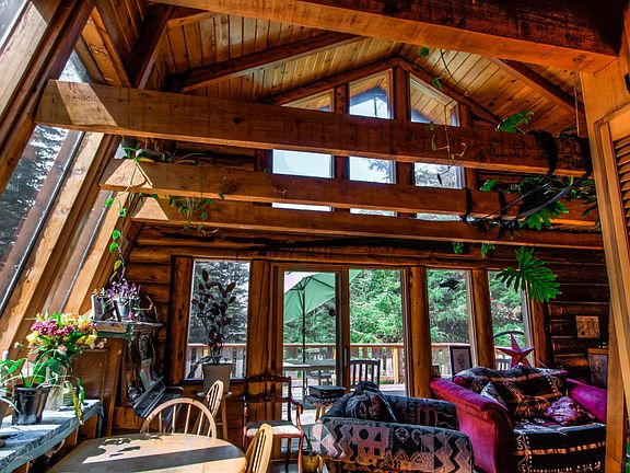 Located in a quiet neighborhood surrounded by hemlock trees, blueberries and mountain views. This unique log home offers plenty of indoor and outdoor living areas- two large decks and an open kitchen/ livingroom layout. A garden and an additional guest house/ studio create possibilities for an artist's oasis!