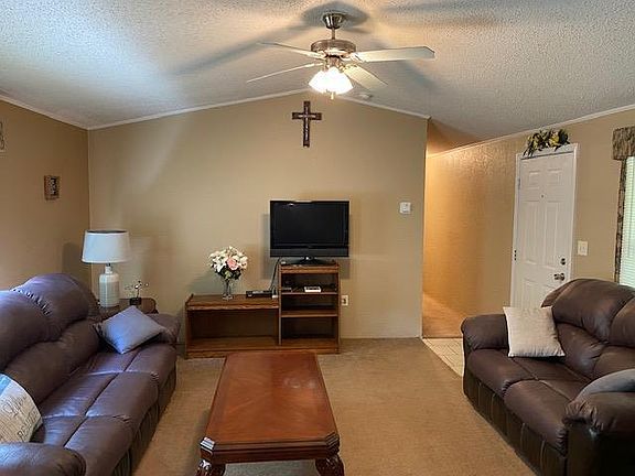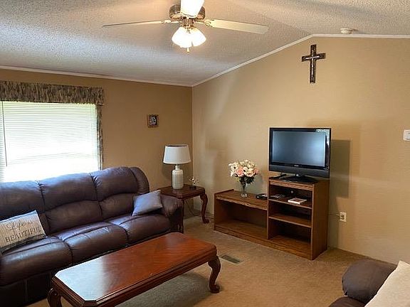 Well maintained 3 bedroom 2 bath was well built with sheetrock walls. Family room is spacious opening into the breakfast/kitchen area. Split bedroom floor plan and seller is leaving furniture. Kitchen has a work island and refrigerator stays. Primary bath has garden tub and separate shower. Inside utility room with washer and dryer. Enjoy the peace and quiet of being tucked away on 1 acre of land.