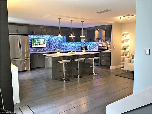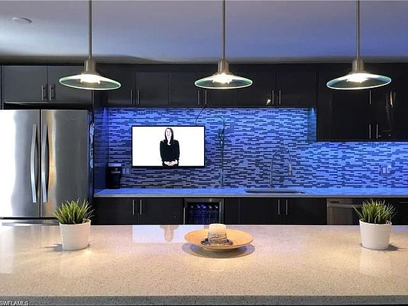 Sleek, ultra-modern remodeling/furnishing still underway - to be completed in November. Stair railing to be installed before occupancy. Final interior design will vary somewhat from photos shown. Large flat-screened HDTVs in all bedrooms, LR & Kitchen, decorator lighting throughout. The first floor glass sliding doors from kitchen and great room open to the private fenced-in furnished courtyard. An extra large kitchen with huge island, stainless appliances, and a wine or water bottle cooler! Half-bath is located downstairs along with the laundry room complete with beach gear. Upstairs, the master bedroom with small balcony features a queen size pillow top bed, double sinks and walk-in spa shower. 2nd bedroom sleeps two in the double bed. The den with a small balcony can be used as an office/reading/TV room or as a 3rd bedroom with use of an air mattress. Roomy guest bath features double sinks. Private and relaxing, yet close to everything. Convenient to Summerlin and US41.