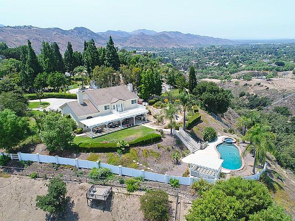 Privacy and Views. On a Clear Day you can see forever! New England influenced 2 story home located near the end of a spectacular ridgetop cul de sac. Private lot with dramatic entrance opens in the rear yard to a wide terraced yard area with a backdrop of the majestic canyon views. This Bridlewood estate features classic traditional architectural elegance from the exterior entry, grand two-story foyer entrance with stunning spiral staircase, archways and soaring volume ceilings. Gleaming wood flooring. The Gourmet island kitchen features an extended eat-in kitchen area, walk-in pantry and access to rear yard. Upper level of resort styled rear yard has oversized yard, patios and built-in barbecue center. Lower level provides for the refreshing pool area providing spectacular 180-degree mountain and valley views all the way past the harbor to the Channel Islands. This home features 3 bedrooms plus a mainfloor (downstairs) office or 4th bedroom adjacent to full bath. The luxurious Master bedroom suite has a w/huge walk-in closet, shower and sunken tub. Interior features include Family room off kitchen with fireplace, living room and formal dining room with dual sided fireplace. Located on over 3 acres in award winning SRTMS school district.