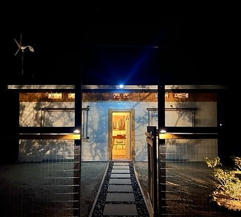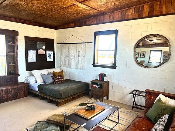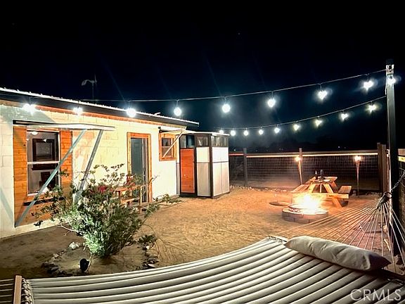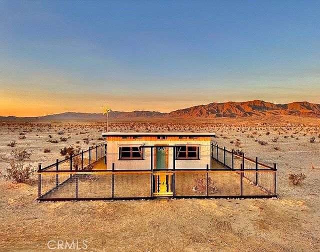 Immaculate recreational cabin on 5 acres of beautiful desert land in up-and-coming Wonder Valley, just 20 minutes to Joshua Tree National Park’s North Entrance and the city of Twentynine Palms, and less than 2 miles from the legendary Palms Restaurant. Nestled against a backdrop of the Sheep Hole Mountains and Cleghorn Lakes Wilderness, this one-of-a-kind homestead cabin comes ready to enjoy with a Nature’s Generator solar power system and wind turbine for capturing clean energy day and night, as well as a kitchenette with mini-fridge, water tank, Ecco-Temp water heater, pump and shower, and Vingli toilet and sink. New custom woodwork throughout, retro aluminum windows, metal roof, built-in furniture, and 6 built-in stained-glass windows make this a stunner from inside and out. The 430 square foot cabin is fully fenced for your pets and security, and has security shutters over every window that also serve as shade awnings. Solar string lights, picnic table, fire pit, hammock and bbq make for an ideally peaceful and picturesque backyard setting, and you will be hard-pressed to find any other cabin opportunity on the market quite like this. The pictures speak for themselves: If you’re looking for a stress-free and serene desert getaway, this is it. Enjoy it exactly as it is or, if you find you never want to leave, add immense value with a well and formal conversion to a single family residence (power poles directly in front & at side of property for easy grid access if desired).