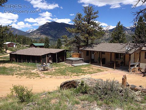Breath taking Mountain Views 360 degrees. 2 bed 2 bath,4 gar. Mobile Home with added living room and laundry. Several lrg outbuildings on over an acre of mostly level, useable land overlooking Estes Valley. Large parking area, Oversized detached 3 car gar and large barn. Separate Rustic outbuilding storage with fenced area for dogs, chickens etc. This could also be a Buildable site for future home. Has great history as a vacation rental and all furnishings, except owner personal property opt