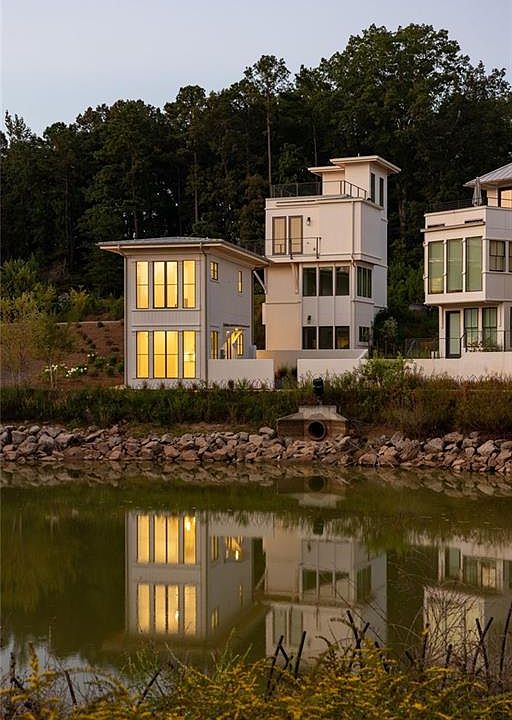 This adorable jewel box cottage on Mado Pond offers thoughtful design and peaceful waterfront living. The open floor plan blends living and dining spaces, highlighted by floor-to-ceiling windows that frame year-round pond views and Rachel Garceau's striking Mado Pond art installation. A spacious courtyard extends off the living room, ideal for al fresco entertaining. Upstairs, the primary suite includes a full bathroom and generous walk-in closet. Perfectly located next to the Mado Amphitheater, you can enjoy seasonal events like quiet evening music in the summertime and intimate community gatherings just right outside your front door. All of this within a short distance of Serenbe’s wellness amenities and 20+ miles of protected forest nature trails.