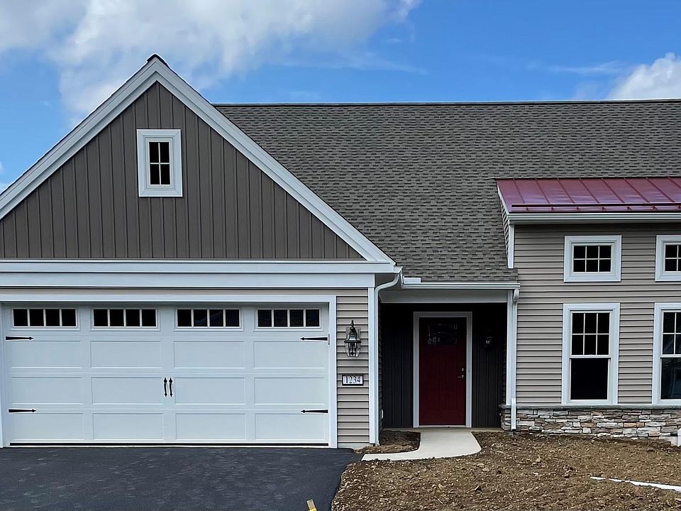 The STANFORD A in Alden Place. Stanford's one-floor living offers not only a beautiful owner's suite but two additional comfortable bedrooms. This well-thought-out plan showcases both efficiency and delightful open space. You will love the covered porch beyond the vaulted great room as your own personal retreat. Alden Place is a 55+ Active Adult Community featuring a 17,000 sq. ft. Clubhouse with an indoor pool, hot tub, fitness center, ballroom, library, billiard room, and coffee cafe. Also, the community has a small fishing lake and access to Rails & Trails for walking and biking.