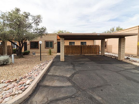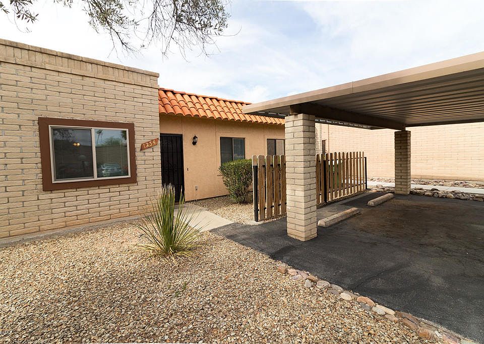 Rare Opportunity in well kept neighborhood featuring a community pool & spa! 3 Bedroom / 2 bath spacious home boasts a large great room/living room just off kitchen & relaxing breakfast nook! Generous master suite, plus 2 other BR/offices-along with many closets and storage areas make this plan especially popular! BONUS-Discover the quiet outdoor living... full length patio with gate to the concrete walk/jogging patio around the entire complex!. Experience tranquility w/ no homes behind you. (Property to the west is owned by a church.) Your 2 car carport is the only one in front of this home! Perfect primary or 2nd home! 1.3 miles to Tucson's famous River Walk, & only minutes to Saguaro National Park, schools, shopping, & restaurants! Call today!