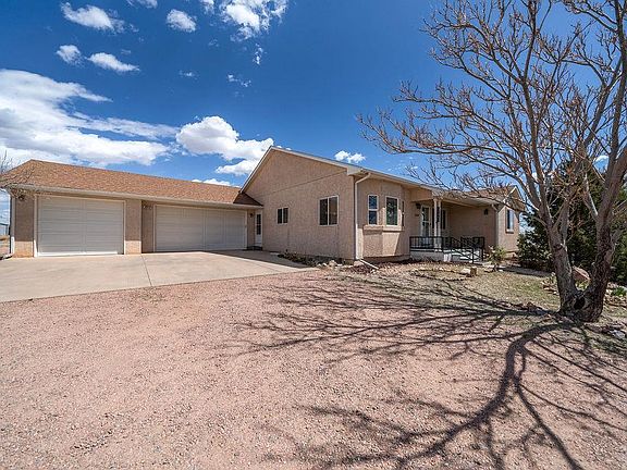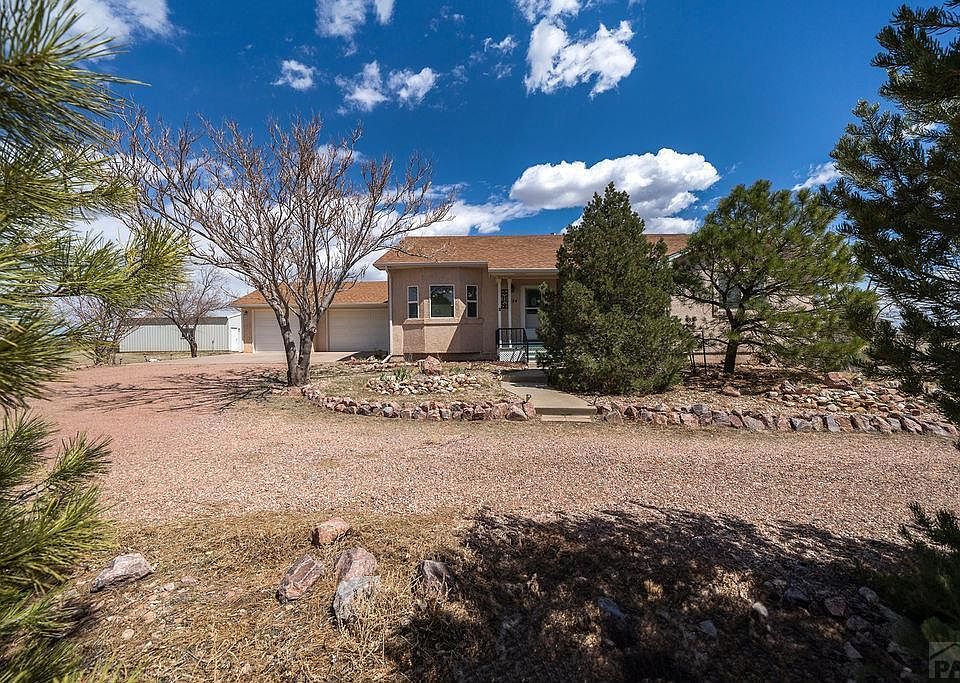 Two lots combined into one large 2+ acre parcel, for a feeling of privacy and view protection. Even lake views from the back yard here. Just a 5 minute drive to be in the Pueblo Reservoir Park!!! Immaculate condition home, built for the builder's own family. Tons of windows to take in the views and light! Large country style kitchen with tile floors and attractive stained wood cabinets. Eating area in a bright bay window area. Small office or den with an outside entrance off the attractive living room with natural gas fireplace. Three large bedrooms separated from the living areas. Generous sized master bedroom can accommodate extra furniture. Huge walk-in closet and generous bath with separate shower and jetted tub. Plenty of outside living too. Large covered back patio with two entrances, and a covered front porch with nice mountain views. Cleary building 30 x 24 with one large vehicle door plus access door, concrete floor and electricity. Large utility room off of kitchen, with pocket door, offers storage, laundry tub, & washer/dryer hookups. Attached three car garage is extra deep and wide with tall doors to accommodate your vehicles (over 800 sq. ft.). Enjoy the rocks, trees and natural landscape that make this property both attractive and lower maintenance. Just blocks from the paved trail leading into the park, to central Pueblo West, and to schools, which are all close by. 2 x 6 construction, roof less than 5 years old, and well-maintained.
