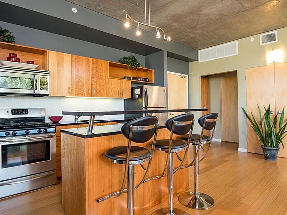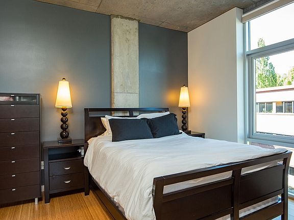The loft-like interior features bamboo flooring, cherry cabinets and high ceilings. The bathroom floors and walls are tiled. Heating and air conditioning are energy efficient. Parking, water, sewer, gas, and garbage service are included. The unit is semi-furnished (couch, bedroom set, bar stools, and built in desk). This quiet building of concrete construction is adjacent to light rail and multiple bus lines. Secure dedicated parking is interior to the building and included in the rent. Bike parking is also available in the garage. $300 move-in/move-out fee