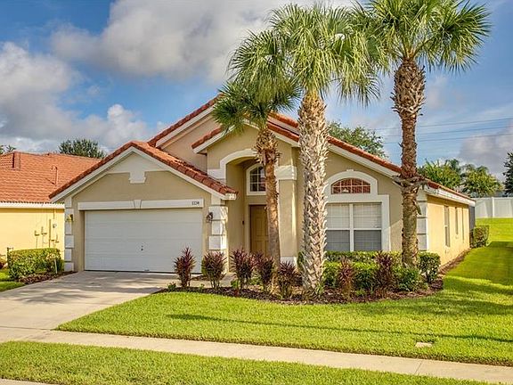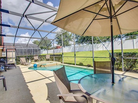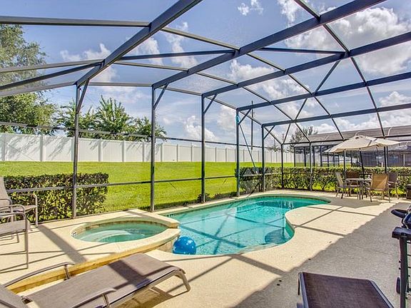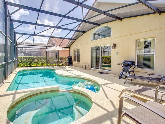 Amazing opportunity and value with this 4 bed/2 bath pool home that is a perfect short term rental or vacation home. Located just minutes from the attractions area and all the first class shopping, dining and entertainment options. This home features a luxurious screened pool patio PLUS a hot tub. The living areas offer an open and expansive layout that feels so spacious with the vaulted ceilings. The kitchen features all stainless appliances, gorgeous granite counters, breakfast bar, closet pantry and a cozy dinette area. The family room presents pool views thru the sliding glass doors. The inside utility room is just off the kitchen for convenient laundering. The master suite provides for pool views and offers a double granite vanity, garden bath, separate shower stall, large walk in closet and owners lock out closet. The spacious guest bedrooms are located at the adjacent side of the home and have access to the guest bath room, again offering an upgraded granite vanity. The home features neutral tones and contemporary finishes. Solana is an amazing Guard gated resort community with an incredible lineup of amenities to please all. These include beautiful resort pool with covered cabanas and hot tub, mini golf, outdoor volleyball court, playground, a welcoming clubhouse with arcade, fitness center, snack shop, and concierge service. Assoc. dues include for your Cable TV, Internet, Ground Maintenance, and more!
