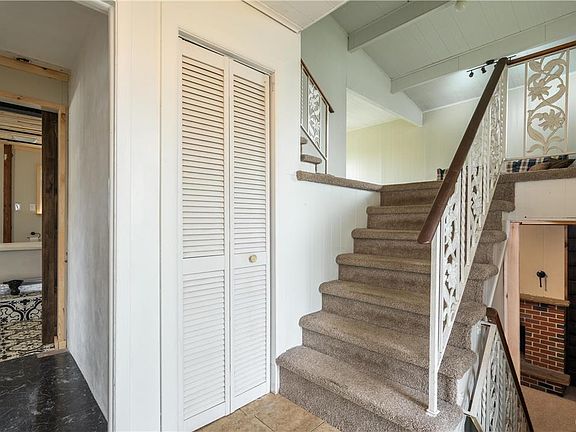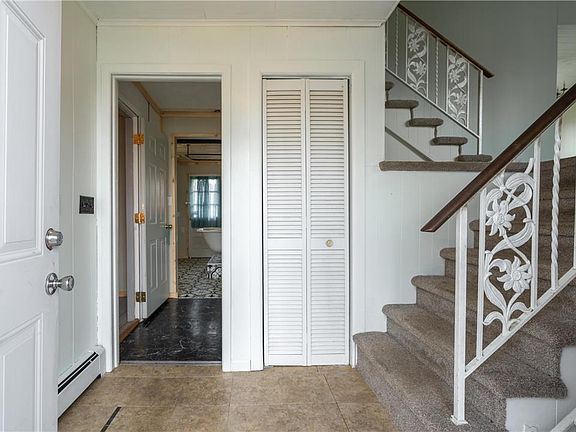 Step onto the first floor and be greeted by a beautifully appointed kitchen and an inviting living room dining room combo, highlighted by a charming bay window and sliding doors that lead out to a deck offering picturesque views of rolling mountains.