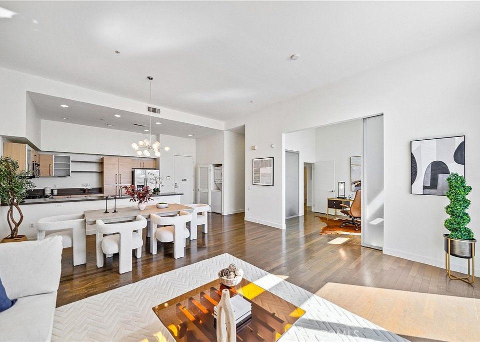 Soaring ceilings and floor-to-ceiling windows flood the open-concept living space with natural light, while wide-plank hardwood floors add warmth and sophistication. The gourmet kitchen is a chef’s dream, featuring high-end stainless steel appliances, custom cabinetry, quartz countertops, and a spacious island that’s perfect for hosting.