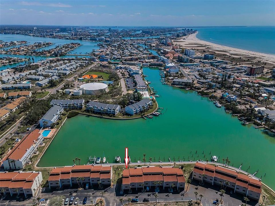 Isle of Capri in Treasure Island. Spectacular waterfront complex only blocks to the sandy white beaches of the Gulf of Mexico. Beautiful water views from this spacious two bedroom, two and one half bath town home with 1,430sf. of living area. Oversized one car garage with waterfront bonus room that is not included in living area. Wood burning fireplace in living room. Master bedroom with balcony offering gorgeous water views. Two brand new A/C units just installed. Transform this property into a showcase! Price reflects updating needed. Well run condo complex with waterfront community pool and boat slips to rent on a first come basis. Exceptional overall location close to the beaches, dining, and shopping. Be sure to view the beautiful virtual tour. -