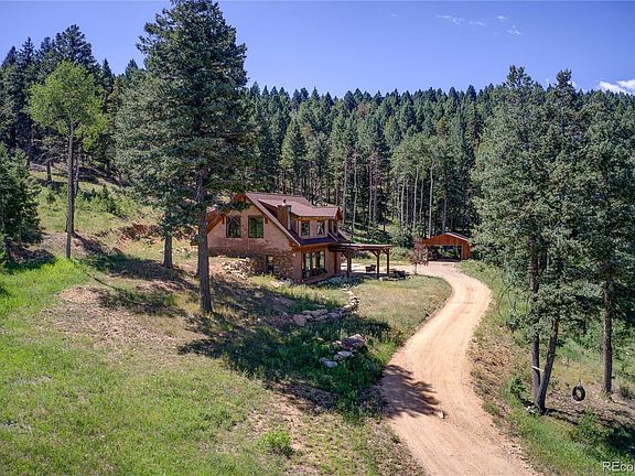 Farmhouse living on over 11 private acres with stunning mountain views!!! Bring your livestock to this awesome agriculturally zoned property complete with domestic well for watering animals, large fenced pasture, flat useable meadow, livestock area, chicken run & large barn with upper hay storage area. The covered front patio with breathtaking mountain views welcomes you home. Charm exudes from many unique custom features including post & beam construction, straw insulated colored stucco walls, barn style sliding doors & rustic built-in touches. Stained concrete floors on the main floor with ample windows and wood ceilings make this open floor plan light & bright. The kitchen features maple cabinets, custom tile backsplash, stainless steel appliances including refrigerator, abundant storage & center island with granite counter. The adjoining living room features beautiful stone wood burning fireplace & awesome views. The dining area with access to rear patio is ideal for entertaining family & friends. The main floor also includes a powder room, laundry room & mud room. Upstairs you will find spectacular views, vaulted wood ceilings, ceiling fans in all rooms & wood floors. The large flexible bonus space for can be used for an office, family room, media room, gym or recreation area. The master bedroom with en suite bathroom opens onto a private rooftop viewing deck perfect for relaxing. The second & third bedrooms are large & feature built in wooden storage & window seating. The Jack & Jill bathroom offers a convenient separate toilet & sink area. Radiant heat floors are ideal for chilly Colorado winters. Roof was newly replaced on home, carport & barn in 2018. Top rated local schools. Remote & peaceful location filled with natural beauty & abundant wildlife yet close to Conifer & Littleton for ultimate convenience & accessibility. Welcome to your mountain retreat!!!