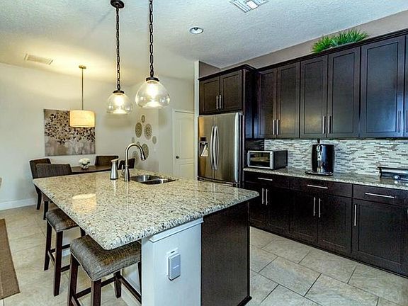Great townhouse for entertaining with spacious combined kitchen and living room. Lucea model at Carrington in Windermere. 1,946 sq. ft., 4 bed, 3 bath with one bed and bath on ground floor. Granite counter tops, stainless steel appliances, 42" Espresso cabinets, designer backsplash, kitchen island bar, and pendent lights give this townhouse a custom look. 18" ceramic tile in a hopscotch pattern throughout the main floor living areas and all wet areas. Short walk to community pool and cabana house. Windermere address with great schools, shops, restaurants, golf courses, and parks.
