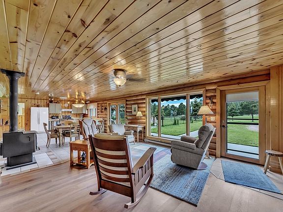 Very attractive log-berm home located in a quiet neighborhood at the south edge of Custer. Country living within a stone's throw of downtown Custer. One level living. Two bedroom - two bath with an office/craft room that could be a non-conforming third bedroom. Free standing wood stove in the living room area complete with a stockpile of firewood. Detached log sided oversized 2 car garage with loft sleeping area. Covered patio. Retractable awning. Fenced dog run. Carport. Electric sauna. Nicely landscaped 2.5-acre yard. No Covenants. This home has been well maintained and shows pride of ownership throughout.