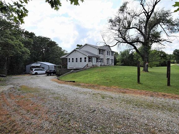 Bring your handyman, paint & flooring choices - this property has SO MUCH POTENTIAL. Popular WASHINGTON FLOOR PLAN with expanded living area, 3-car garage, lower level suite & OUTBUILDING WORKSHOP, situated on 2 ACRES. UNINCORPORATED with NO KNOWN RESTRICTIONS! Over 3000 sq ft above-ground with 4+ bedrooms, 3.5 baths, "T" staircase. Solid wood doors, crown molding, great room brick fireplace with built-ins. HUGE MAIN FLOOR REC ROOM (plumbing for wet bar), wall of windows & access to screened deck. Oak kitchen cabinets, breakfast room bay, planning desk, pantry. Flexible upstairs loft/landing. Double doors to master suite, corner soaking tub, dual sinks, separate shower. Huge 31-ft deck stretches along rear of home. Walkout lower level finished suite with kitchen, bath & sleeping room. 40x28 metal outbuilding with rough-in bath, ample electric. NEWER ROOF. Offered in "as-is" condition with seller to make no repairs, inspections or warranties. USDA 100% financing eligible!