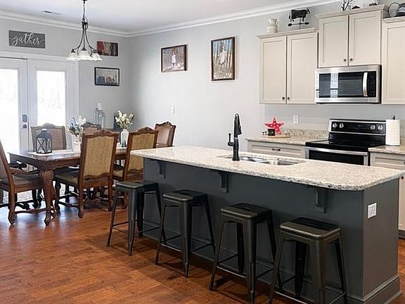 This 9.24-acre property in the heart of Stokes County is near the bottom of Hanging Rock with beautiful views. A creek winds through the property which consists of multiple open fields for endless opportunities. This home one-level ranch and boast 9-foot ceilings with an open floor plan for plenty of entertaining room. The safe room has reinforced flooring to hold extra weight(not pictured). Enjoy arriving home by crossing the creek and driving up the newly added concrete driveway when you get closer to the house. A new oversized shop and detached 2-car workshop/garage with electricity and oil heat offer incredible functionality. Artisan well on site. Peaceful country living with a truly unforgettable setting. The neighbor has an easement to access their home. Dont miss out, come see this one for yourself.