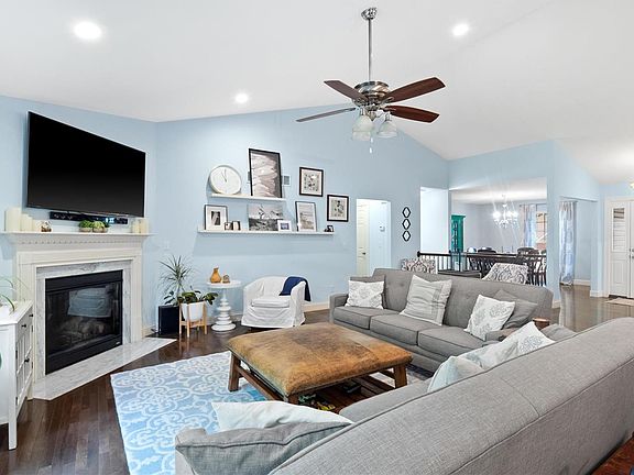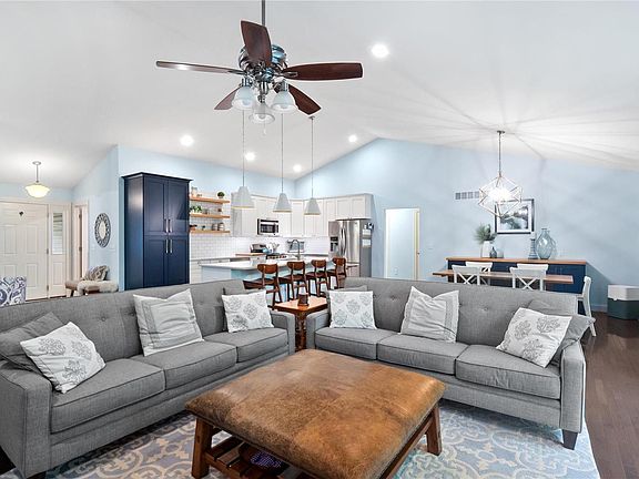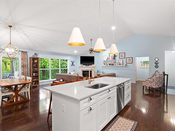 Vaulted great room w/ wall of windows, wood floors, gas fireplace & wooded/lake views. Kitchen remolded in 2021 w/ Anne Marie Designs has gas range, ss appliances, 2 drawer extra fridge, custom cabinetry, silestone counters, handmade tiles & on trend lighting. Made for entertaining! 3-Car Garage & main level, custom mud-room w/ laundry, sink, granite, storage. Divided bedroom floor plan includes primary suite w/ bay window, soaking tub, shower, double sinks & a walk in closet dreams are made of & 2 additional bedrooms/full bath. Finished lower level adds additional 1200+ sq ft of living space w/ rec area, family room, 4th bedroom, full bath, ample storage and wet bar. Professionally installed monkey bars & climbing wall will keep the kids busy! Bring your fishing poles for the stocked lake! This house is summer ready!