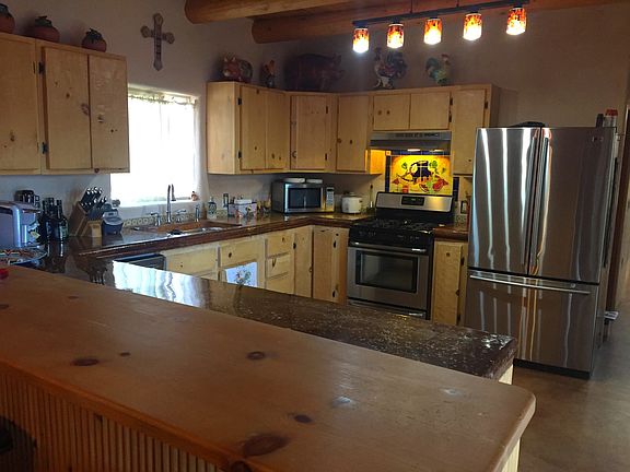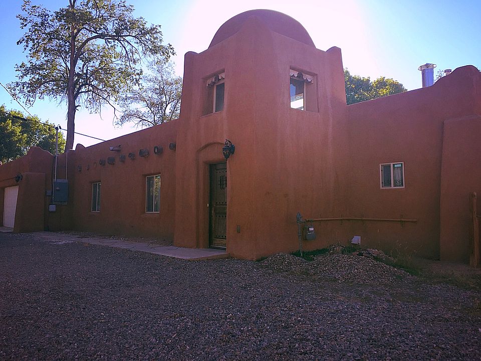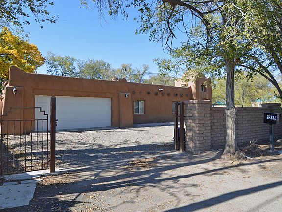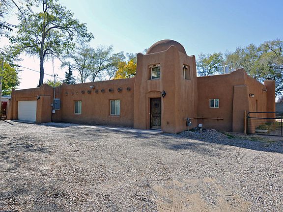 Welcome home! This custom, energy efficient 3 bedroom, 2 bath adobe hacienda is located in the South Valley and sits on 1/3 of an acre. Features include viga ceilings and nichos throughout, radiant heating, independent zoned cooling system, diamond plaster interior walls, kiva wood burning fireplace, custom concrete counter tops, stained concrete floors, handmade solid pine doors & cabinetry, low-e windows and so much more! The master suite includes his/her sinks, a marble tub, and 2-way fireplace!! Spacious 800 square foot hacienda style patio with access from every room is a fabulous bonus. Mature trees surround the property and electric security gate opens to your driveway. Well maintained & superior craftsmanship make this a MUST SEE home!