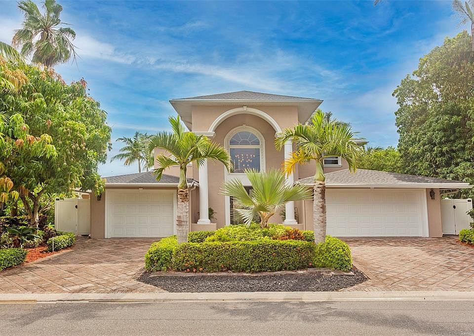 Spectacular, rare waterfront home in the beautiful Isle of Capri just minutes to the Gulf of Mexico by boat. This house with its 3 stories has 4 bedrooms, 4 and 1/2 baths, a bonus room, garage space for 3 cars, split 2 and 1, 800 square feet of covered porches and tons of closet space. The ground floor begins with a beautiful 2-story foyer that leads into the main house tiled throughout with an open floor plan, 10 ft ceilings, kitchen with granite counters, living room, dining room, 3 bedrooms of which 2 rooms have en-suite bathrooms and one with sliders right out to the pool. From the foyer, ascend a stunning staircase to the master suite, complete with living room, dining room, half bath, laundry room, master bedroom, master bath, a dream master closet that is 16ft by 16ft, and a balcony with amazing views of the intracoastal waterway. From your master suite balcony, ascend a spiral staircase to a bonus room on the third floor that can be used as an office, media room, workout room or just plain party room with a bird's eye view of St. Petersburg. From the main living room and dining room, walk outside to your large covered patio, your pool, surrounded by luscious landscaping and onto the extra-large dock with a 12k lb boat lift on one side and davits on the other side for a smaller water craft. All new paint and ceiling fans inside, new roof, new flooring on 2nd and 3rd floor. New sliding glass doors on ground and second floor. So many other extras to see!