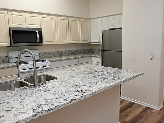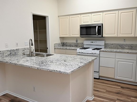 "The Heights" one bedroom/one bath, Top floor (3rd floor). Very open floorplan with vinyl wood like flooring throughout with plush carpeting in the bedroom. The remodeled kitchen has exceptional counter space and a big walk-in pantry. Granite kitchen counters. stainless ref. dishwasher and microwave. The bathroom has been upgraded. This complex is within walking distance of shopping, dining, and cinema. Resort-style Swimming pool, Jacuzzi, private exercise/workout room. Covered parking space #155. Great place to call home! Available 11/3/24 Owner pays HOA fees, water, trash No pets