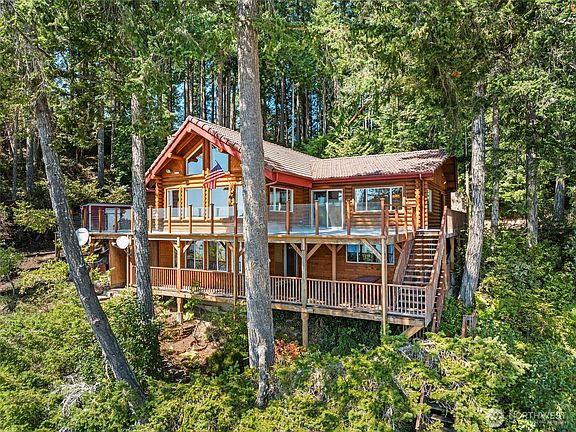 Discover the ultimate Pacific Northwest waterfront lifestyle! This custom log home sits on 109 ft of low-bank waterfront along Pickering Passage with private beach and tideland rights. From your backyard, harvest clams and oysters, launch a boat or paddleboard, and watch seals and orcas glide by. The 4,160 sq ft interior offers 3 bedrooms, 3 bathrooms, a main floor primary suite, den/office + loft. Features include hand-picked logs, tongue & groove ceilings, tile roof, radiant heat, and two wood-burning fireplaces. Expansive decks showcase views of Harstine Island and the waters below. Blending rustic charm with efficiency, this retreat is offered for the first time—come make it your own with a personal touch on a rare piece of PNW paradise