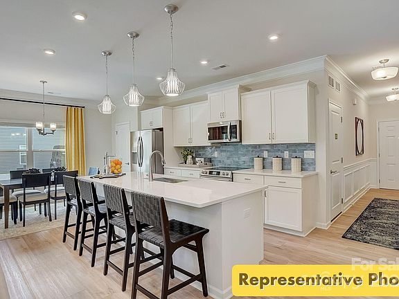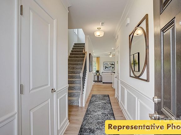 Discover the Braselton II at Country Club Village, featuring an open and airy main level that's perfect for entertaining. You are greeted by beautiful open rail staircase as soon as you enter this homesite. The main floor includes a dining area, a spacious family room, and a stylish kitchen with 36” modern cabinets and solid surface countertops. Enjoy meals at the large eat-in kitchen island or step out onto the covered rear patio for a breath of fresh air. The covered patio is perfect for entertaining guests as well. With additional breakfast area windows and pendant lights, the main level truly lights up at any time of the day which pairs well with the beautiful backsplash also in the kitchen. Upstairs, you'll find a spacious owner's suite with a massive walk-in closet perfect for your storage needs. The owner's bath offers a spa-like experience with a large tile shower, a linen closet, and a private water closet. The owner's suite bath also is accompanied with a double vanity and beautiful marble countertops and black interior finishes. The upper level also offers three secondary rooms that use a shared full bath perfect for hosting. The laundry room is also nestled on the upper level for convenience.