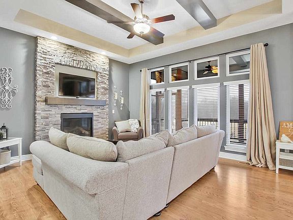 Better than new former model home on the golf course at The Oaks. Covered porch and craftsman style door lead you into the spacious entryway, allowing for privacy from the front of the home. Oversized windows throughout allow for tons of natural light a great views of the tree line. Cozy living room with stacked stone, gas fireplace and wood beams is open to the huge dining area and kitchen making it the prefect layout for entertaining. Gorgeous wood floors throughout. Kitchen features a stunning wood ceiling, oversized island, white cabinetry with under cabinet LED lighting, wall oven, built-in convection and microwave oven, beautiful countertops, pantry, and gas range. Spacious master bedroom has view of the pool and golf course with an absolutely exquisite master bath. As you walk between the custom his and her closets you can see the incredible stacked stone wall around the soaker tub with a tiled shower on one side and a water closet with bidet on the other. The main floor laundry and mud room with built-in bench and hooks can also be closed off with a great barn door. You won't find a better -basement layout if you like to entertain. The wet bar opens up to a pub style space that would be perfect for a large game table and has its own ½ bath. A storage space off the wet bar would be converted to a wine room. Rec room features an arched, stacked stone with a build in entertainment cabinet and easy access to the pool. An office, two additional bedrooms, and another full bath complete the interior. All the landscaping and fencing has been completed with irrigation well and sprinkler system making maintaining a breeze and leaving plenty of time to relax around the saltwater pool and enjoy the privacy of the back yard. Massive, covered screened in porch gives you a great spot to relax out of the sun. This home truly has it all!