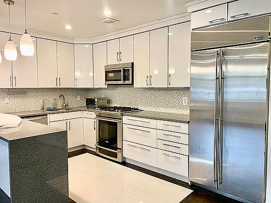 This unit has all the bells and whistles plus ONE PARKING spot!! First floor unit with gorgeous kitchen with large island and loaded with lacquer cabinets and Bosch appliances. Open living/dining room area which will easily fit - full size dining table. Large bedroom will fit a king bed, washer/dryer in unit and lots of closets. This unit is complete with a beautiful marble bath and it's very own parking spot in the garage and central heat and AC. Small pets on approval, tenant pays all utilities. This coveted building has a part-time doorman, package area, garage, shared patio area and a beautiful front garden. Close to shops, transportation and restaurants. You must have excellent financials, guarantors are ok, with minimum $112K income. Full application where you must provide 2020 tax return, bank statement and pay stubs.