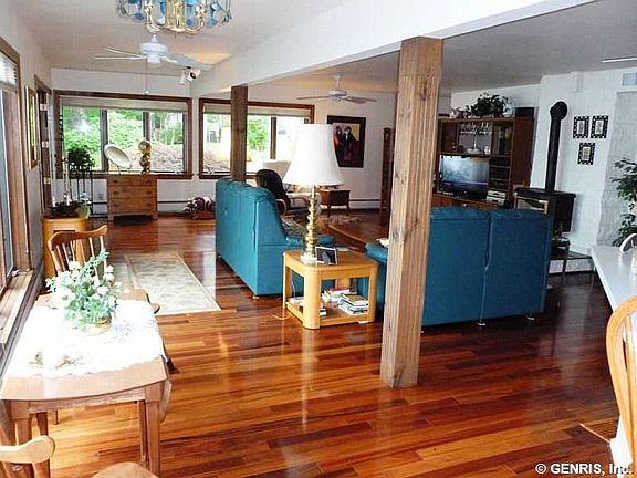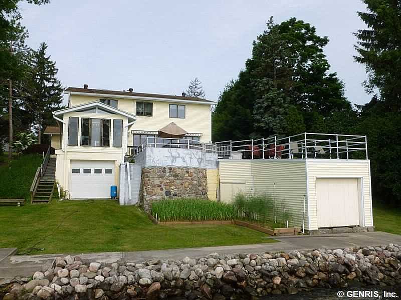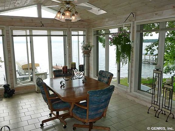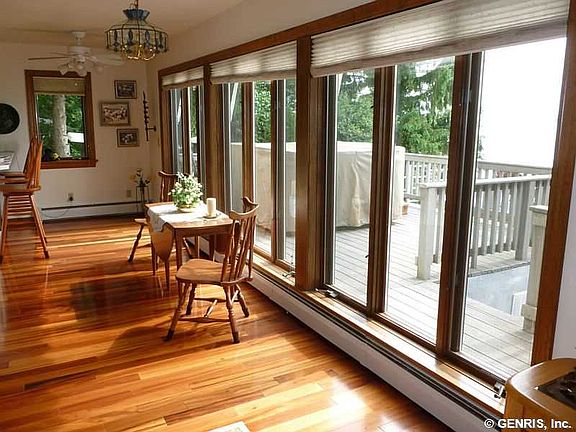 Seneca Lake Paradise! The spacious, open floorplan and lakefront sunroom overlook multi-level hardscape patios and decks. A fully finished waterfront with permanent docks and boat hoist are just steps away on a level beach. You'll enjoy the beauty and low maintenance of gorgeous plant beds, each with a permanent watering system for perfect blooms througout the season. Solid 3/4" Tigerwood flooring on reinforced floors sets a standard for this home that is unmatched in the area. 51 windows ensure you'll love this lakefront retreat!