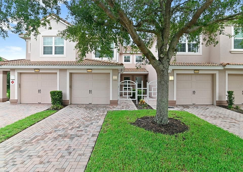 Desirable Bella Trae GROUND FLOOR Stacked Flat/Condominium located on a lovely POND LOT, featuring 2 bedrooms 2 bathrooms, PLUS AN OFFICE that could be used as a third bedroom. Bella Trae is a picturesque GATED community of beautifully designed townhomes and condos, and the grounds are gorgeous, with immaculate landscaping surrounding ponds, walking paths, and an amazing clubhouse. The clubhouse has tons to offer including a resort style zero entry pool and hot tub adjacent to a pond and water fountain, putting green, library, game room, tennis/pickleball courts, business center, billiards, gym, and more! When you enter the unit the office is immediately on the right with double doors, this could be used as a third bedroom, game room, office, or so much more! The guest bedroom is located in the front part of the unit and features a large walk-in closet and a guest bathroom just outside the door. This unit also has an indoor laundry closet near the entry to the ATTACHED GARAGE. The main living area is very spacious for a condo, offering outstanding water views and gets lots of natural light. The kitchen features high-end cabinetry, stainless steel appliances, and a breakfast nook area. The master bedroom is located in the back of the unit with a large master bath, walk-in closets and water views! The SCREENED LANAI is the perfect place to start the day with your morning coffee right on the pond. Book your showing today! HOA Includes landscaping, beautiful amenities, and basic cable and internet.