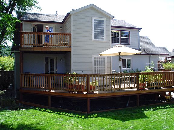 Wonderful, large home w/many upgrades: dual pane wdos, newer laminate flooring in Country KT, both BAs have Jacuzzi tubs; upstairs tub has its own 80 gal water heater. Master BR has private rear deck. Large LR/DR combo. 2 lower level BRs could be modified into a large Master Suite. Ex-lg double garage w/bench 7 stg shelves. House wide rear deck, fenced front & backyards. All siding replaced since 2001. Lot size may allow 2nd Residence to be built in back (alley access). Could be 2 family setup.