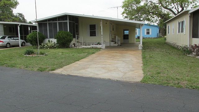 Home Features: This home includes the following features: metal roof, metal siding, soft panel ceilings, electric heating, carport, storage shed, gutters, shutters, ceiling fan, central air, sun room, oven, refrigerator, clothes washer, clothes dryer. WHAT A STEAL THIS HOME IS!! Situated on a beautiful lot, close to clubhouses, pool and recreation area. This home has a metal roof with carport. Attached is a beautiful sunroom, light and bright and cheery. Linoleum floors, cheerful eat in kitchen and adequate spaced bedrooms. The home has been well cared for with a lot of original features. This home is PERFECT for snowbirds, single or couple. Priced right