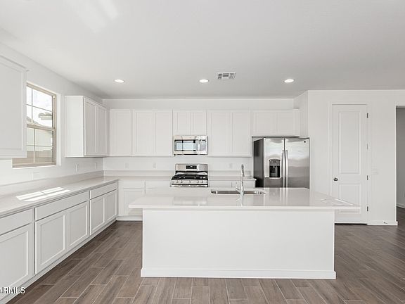 Explore this must-see Agate home, ready for quick move-in on an 8190 sq. Ft homesite boasting driveway pavers and front yard landscaping. Included features: an inviting covered entry; an expansive great room; an open dining area with center-meet doors leading out to a covered patio; a well-appointed kitchen offering 42'' upper white cabinets, stainless-steel appliances, quartz countertops, a roomy pantry and a center island; a convenient laundry; a stunning primary suite showcasing an immense walk-in closet and a private bath with cultured marble countertops and double sinks; three additional bedrooms and two additional bathrooms, a covered patio and a 3-car garage. This home also offers ceiling fan prewiring, 7 x 22 stone tile flooring in select rooms, carpet in the bedrooms only, a garage service door leading to the backyard, 8 Ft garage doors, a gas tankless hot water heater, pre-plumb for a soft water loop, a gas stub at the patio, 2-panel square 8 Ft interior doors and exterior coach lights.