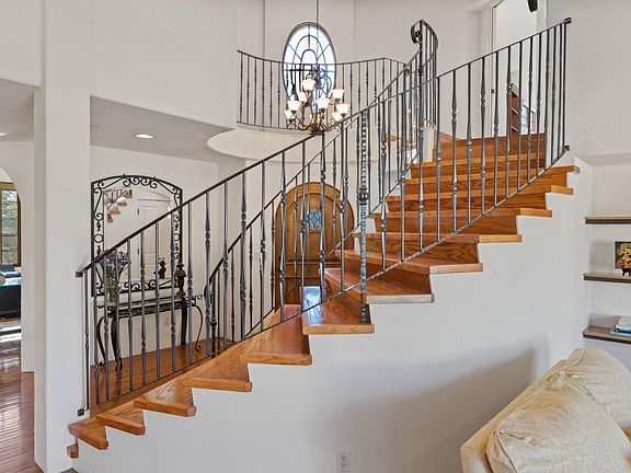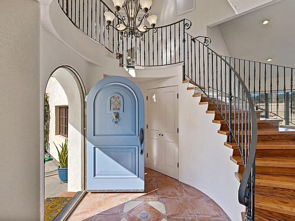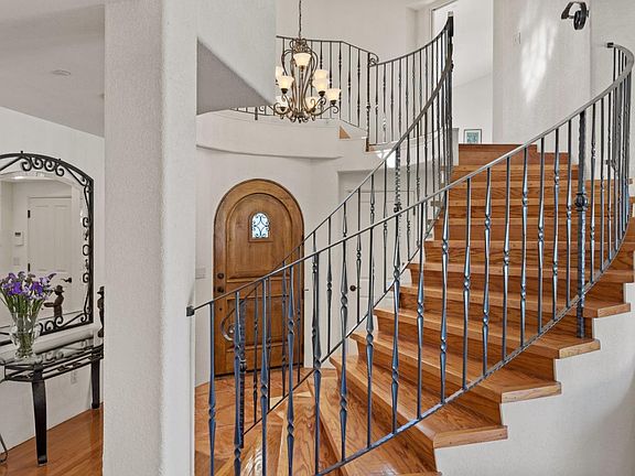 Surrounded by white stucco walls this private and gated yard, houses a pleasant red tile-roofed Spanish Mediterranean style home. The yard is full of bougainvillea plants growing around the grounds. Pleasant weather allows the garden to have various fruit trees including, guava, nectarine, avocado, cherry, peach, lime, orange along with a grapevine. The front door greets guests with a turret-style entry, beautiful, tiled floor, and curved stairway. The vaulted ceiling in the family room with tall windows fills the inside with light. A fire pit, fountain, bar-be-que area, and a pergola sitting area provide a place to relax and or enjoy the outdoors with guests. The main bedroom and a guest suite are located upstairs. The downstairs contains two guest rooms, an office, and a formal dining room. A three-car garage and two driveways leave plenty of off-street room for vehicles or other toys.