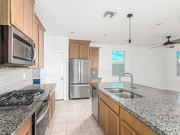 The Marbella Ranch community is in a prime location to take advantage of the upcoming Spring Training baseball season at Camelback Ranch, Tanger Outlets shopping, food/entertainment at Westgate, ParkWest & Desert Diamond Casino. Premium lot with large back & side yard, adjacent greenbelt, double gate & additional privacy. Greatroom style floor-plan w/ neutral colored tile in most of the home, new carpeting in the bedrooms, fresh interior paint in the bedrooms & main areas. The beautiful kitchen features 42'' cinnamon maple cabinets w/ upgraded crown moulding, granite counters, tile backsplash, SS appliances, gas cooktop, island w/ under-mount sink, breakfast bar & a stand-alone nook/desk/coffee or wine bar w/ decorative backsplash to the ceiling. Spacious living area, suitable for any furniture arrangement, & excellent for those that like to entertain. Split master bedroom w/ attached bath featuring double sinks, private toilet room, walk-in closet & walk-in shower. The backyard is a blank canvas for the new buyer, but has irrigation for grass and an added concrete pad for a table & chair set, fire-pit/seating or grilling area. This year 2020 Meritage built home has some of the best energy efficient materials used in the industry today; including, spray foam insulation (walls & attic) that keeps it comfortable & quieter inside, Low E windows & smart home features. You won't want to miss this opportunity!