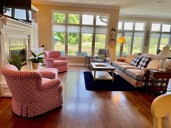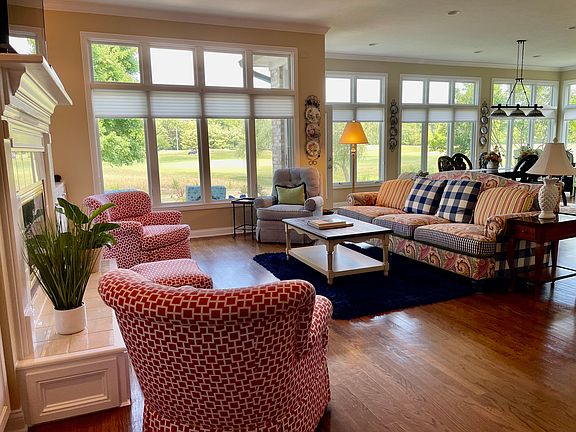 Beautiful golf course & pond views from an abundance of windows all across the back of this charming house. Morning sun w/pleasant evenings on the patio. Located in popular Plum Creek on a quiet street. Home offers an open plan with a sizable area for entertaining. Bright & cheerful w/natural light. Spacious Kitchen has an oversized island that fits 6+ bar stools and is open to a sun room (being used as a large dining room). Great room has fireplace & built-in bookcases & is open to the kitchen & Sun Rm. Those rooms & MB Bay window all have views of the golf course and pond. There is another dining area off the great room. The garage is a 2-car but has another room for plenty of storage or knock out wall to make it a 3-car tandem garage.