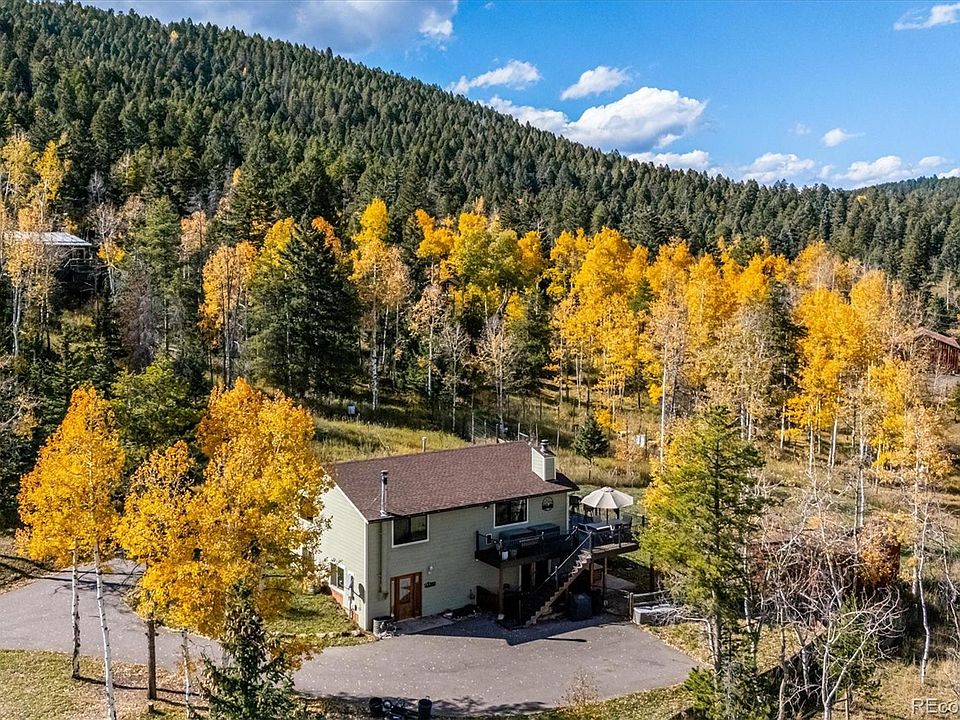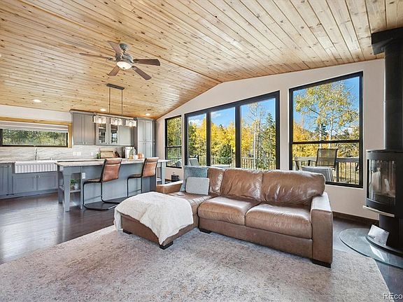 Nestled among the Aspens in the highly sought-after community of Silver Ranch Estates, this stunning home offers the perfect blend of comfort, style, and breathtaking natural beauty. Located on a quiet cul-de-sac, you'll enjoy peace, privacy, and unmatched 360-degree mountain views that make this property truly one of a kind. The bright, open-concept kitchen is ideal for entertaining, featuring a spacious island, stainless steel appliances, soft-close cabinetry, granite countertops, a charming farmhouse sink, and plenty of natural light. The adjacent great room showcases soaring tongue-and-groove vaulted ceilings and a cozy, yet expansive atmosphere perfect for gatherings or quiet evenings. Open the impressive wall of glass bi-fold doors to seamlessly extend your living space onto the expansive deck—perfect for taking in the views or enjoying Colorado’s fresh mountain air. When the weather turns, head downstairs to the covered patio with a rain-free roof system, allowing you to stay outside and dry no matter the forecast. Warm up during snowy winter nights by one of the two highly efficient wood stoves, which also help significantly reduce heating costs. Additional energy-efficient features include new windows upstairs, a tankless hot water heater, and ceiling fans throughout. This home was built with long-term durability in mind, featuring impact-resistant shingles and cement board siding—features that may qualify for reduced homeowner’s insurance premiums. The domestic well (with both UV and canister filters) is permitted for watering a horse or small livestock. Additional features include a reverse osmosis water purification system, paved driveway, and a spacious shed/workshop for all your toys. Don't miss this unique opportunity to own a piece of mountain paradise. Schedule your private showing today!