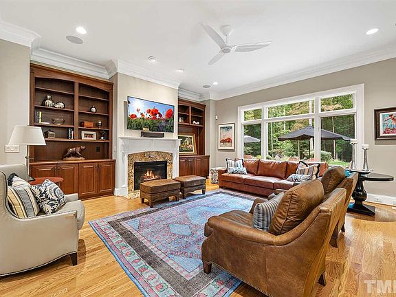 Gated community near Falls Lake. Pristine, like new estate on 2.28-acres, 1st flr master bdrm, guest suite & study. Incredible open kit w/unique curved breakfast bar, center island, Viking gas range w/hood & butler's pantry. Huge bonus rm, theater w/wet bar & wine chiller. 11' ceilings, extensive trim work, transom windows. 4 zone HVAC. Private level backyard w/room to add pool-previously permitted. House has FIBER OPTICS & full gigabit internet connections. Large separation between lots, very private.