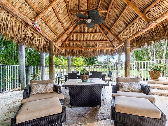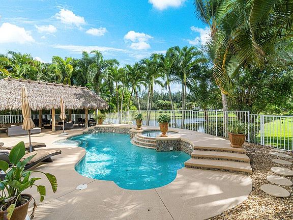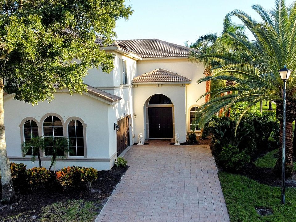 A true 6 bedroom 4 bath Mediterranean home with over 4,100 living square feet and 5,000 total square feet. It's positioned on a corner lot with a one of a kind Tropical Oasis backyard which make you feel like you're in paradise includes an oversized specially made Tiki Hut (cost of $25k) perfect for entertaining and relaxing while enjoying your own custom heated swimming pool and spa built in 2008 with waterfall overlooking the lake. No rear neighbors. It comes with $50k Solar Panels which will save you thousands of dollars per year on your electric bill. Frameless shower doors in every bathroom. Wood floors in stairs, large loft area and master bedroom. New carpet in 4 bedrooms upstairs. 3 car garage plus more parking space on double driveway. 1 bedroom and 1 bathroom downstairs. Natural Gas for your Range, Water Heater and Dryer. Hurricane garage door. Accordion shutters upstairs and Aluminum Shutters downstairs. Exterior grill stays with the home. Kitchen appliances aprox. 5 years old. Laundry appliances are 2020. Main AC unit is 2021 and the smaller unit is original. Natural Gas Water Heater is 2016. Furnishings are negotiable. Excellent location close to everything but tucked away from all the noise. This is the best location in Wellington right in the middle of new developments being built Lotus Wellington and Tuttle Royale which will bring many new restaurants and entertainment options right next door. HOA fees and amenities include 24 hour manned security, high speed internet service, your lawn mowed along with common areas, ADT security service, monthly residence activities, lawn irrigation, tennis courts, pickle ball court, basketball, heated pool, fitness center, game room, playground, jogging/running/cycling paths and more.