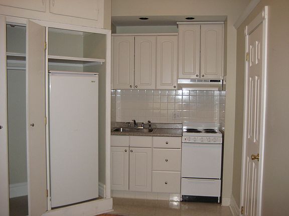 Great studio apartment w/hardwoods, large closet, good storage space, great light, secured building, free off-street parking, coin-op laundry available. Cat friendly.