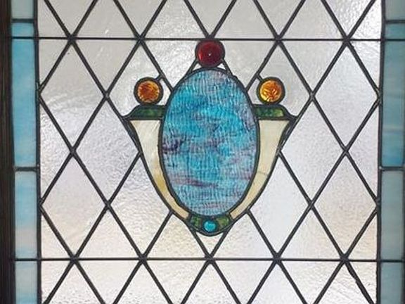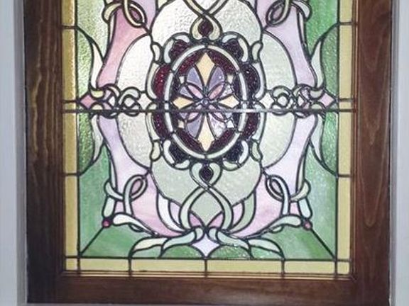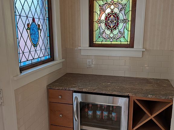 Glass sliderHigh-end finishesCustom-fit maple cabinetsBuilt in barStain glass windowsTrack lightingFormal dining room