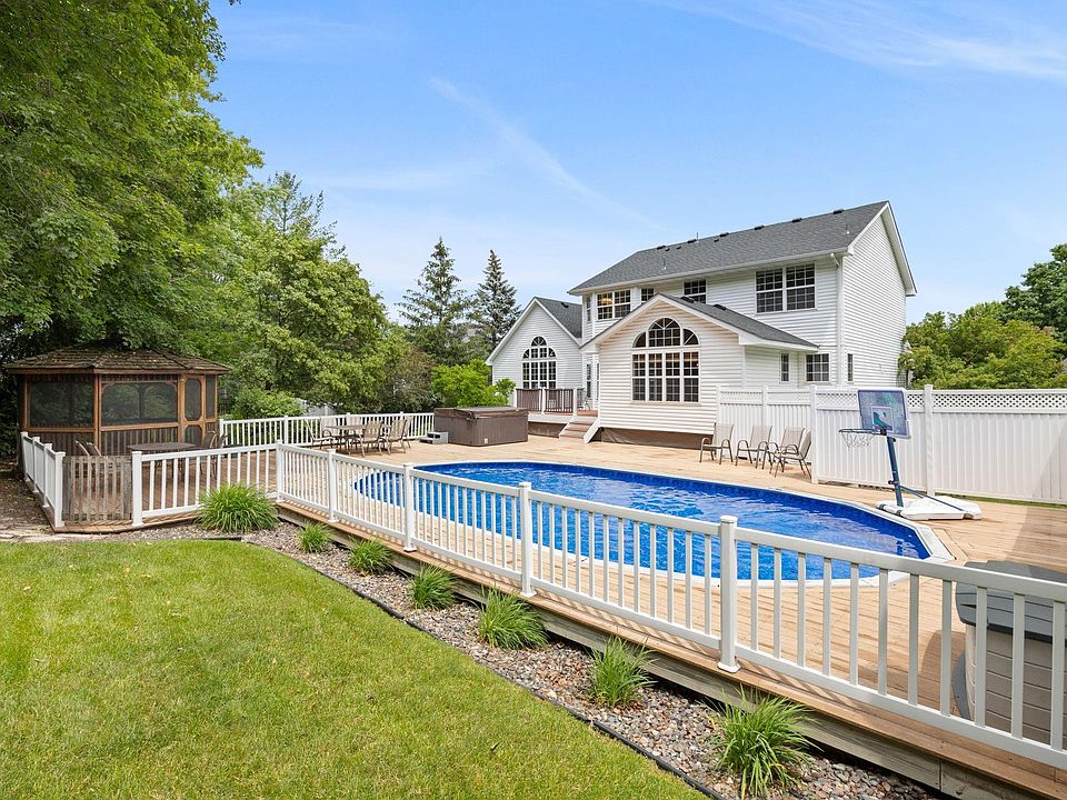 This home has it all! 4 bedroom, 4 bath 2-story featuring kitchen with center island, maple cabinets, SS appliances & refinished hardwood floors. Primary suite with private sitting room and bath with separate jetted tub & shower. 4-season porch, 2 fireplaces, office with built-ins, vaults, 6 panel doors, wet bar, mud room with built-in lockers, surround sound, newer flooring includes carpet, LVP & LVT. New roof, pool liner, furnace & AC. The backyard is an oasis boasting an aboveground pool, gazebo, multi-level decks, circular paver patio, firepit, pondless waterfall, perennial gardens & wooded backyard views. Large cul-de-sac lot is beautifully landscaped and backs up to 10 acres of school-owned trees. Great location close to schools, parks, shopping and Lake Rebecca Park Reserve.