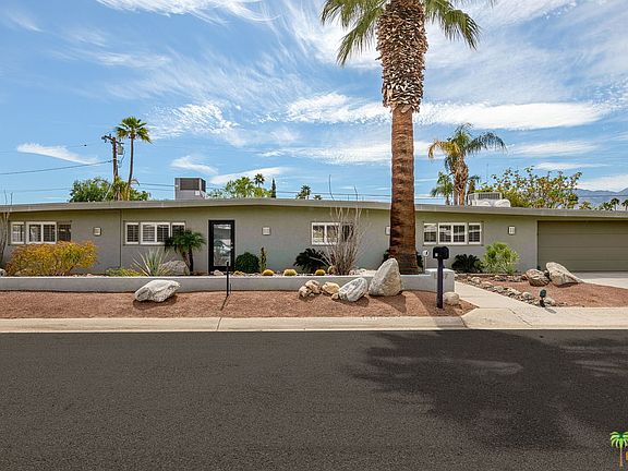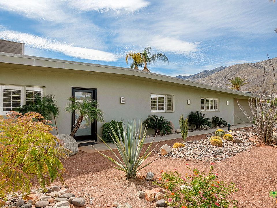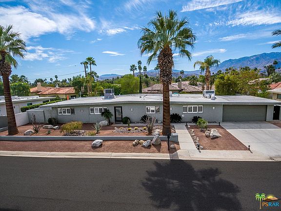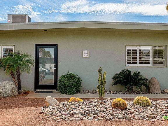 Built in 1956 this quintessential Mid Century Modern home is centrally located in Movie Colony East. The centralized living, kitchen and dining areas will be the hub of activity as they easily flow to the back yard with fire feature, pool and spa showcasing our incredible mountain vistas. Inside right off the dining area with updated lighting feature is a bonus room or den and laundry area. The master bedroom also has direct access to the back yard and both bathrooms have been updated. The parking area with garage door has a large storage area shielded from the street and great for storing bikes and pool accessories out of eye view. The home was also just recently refreshed with paint and carpet and is ready for the next steward. This property was also a cash generating vacation rental and may lend itself to that again depending on your desires.