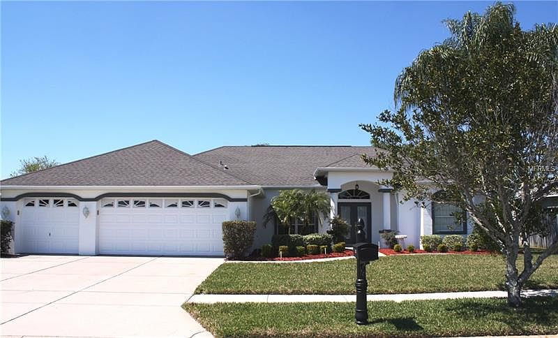 DIVE IN! Bright, Open & Airy Florida Style Pool Home with Corner Lot and Oversized 3.5 Car Garage! 4 Sets of Sliding Glass Doors open this home up to the Covered Lanai & Pool Area that is Great for Entertaining Family & Friends. Master Suite has Wood Laminate Flooring, Sliding Glass Doors leading out to the Pool and a Glamour Bath with a Relaxing Jetted Jacuzzi Garden Tub and a Separate Shower. The Bonus/Game Room has plenty of room for a Pool Table or can serve as a great Media/Theatre Room. Custom Ceramic Tile & Wood Laminate Flooring throughout the house - no carpet anywhere. Kitchen has Solid Surface Counter Tops, Decorative Tile Backsplash and Updated Stainless Steel Appliance Package. PVC Privacy Fenced back Yard. Split Bedroom Plan. Extras Include: Exterior Pool Bath on lanai, Landscape Boarders, Swaying Palm Trees, Raised Panel Cabinetry, solid surface bath vanities, interior laundry with wash tub, Heated Pool with both Solar & Heat Pump Options, ceiling fans & low association fees of only $490 per year. The Developer Built this subdivision UP higher than the original base flood elevation so that the residents would NOT be required to pay flood insurance. Great Centralized Location, with access to the I-75, I-275 Corridor as well As all of the shopping & restaurants at the Tampa Premium Outlets & Wiregrass Malls.