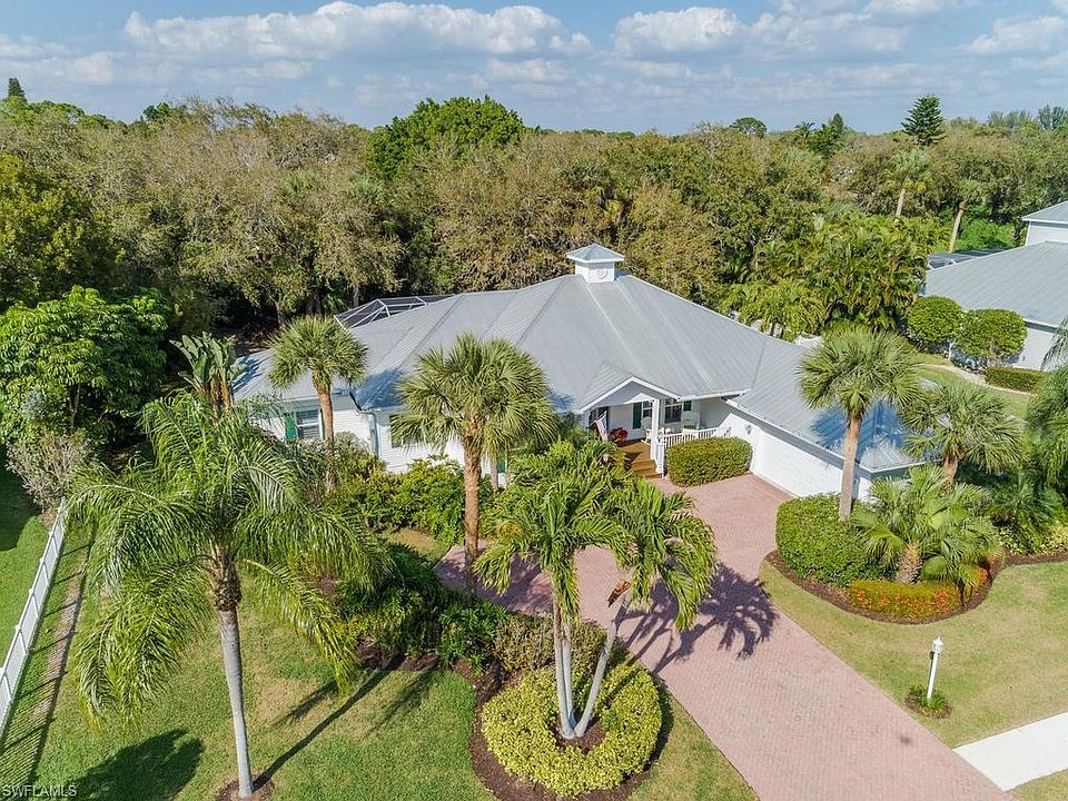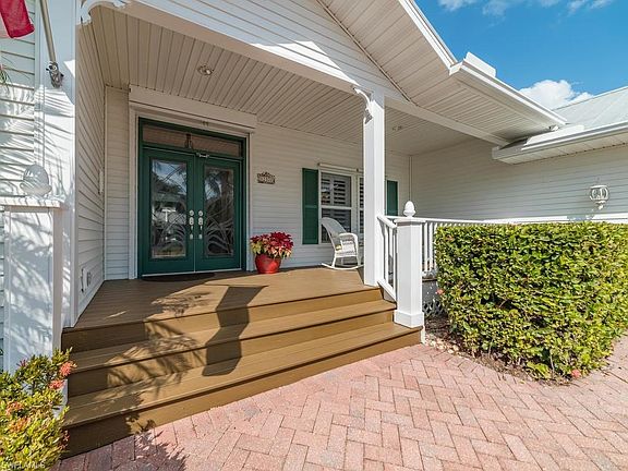This Olde Florida style home exudes a warm welcome feeling the moment that you walk up the steps to the covered front porch. Etched glass double doors, split floorplan w/three bedrooms, two baths, a den plus a large bonus flex room and separate dining room. Generous living areas with four sets of French doors from the living room, Master bedroom and rear guest room flow seamlessly onto the back veranda and screened pool - perfect for enjoying Florida living! The Designer kitchen is wrapped with beautiful wood cabinetry, granite counters and a built-in breakfast area. Other notable features are Plantation shutters providing style, shade and privacy, master bath w/soaking tub and separate shower, walk-in closet, large laundry room, brick paver driveway, side loading garage, metal roof, estate lot, mature vegetation. Located near Sanibel the gated community of Coconut Creek is reminiscent of earlier times with sidewalks, streetlights, underground utilities, clubhouse, pool and tennis.