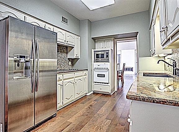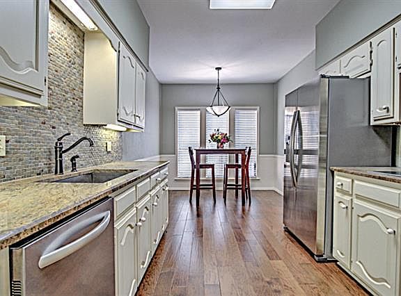 JUST LISTED ONE LEVEL, 2 BEDROOM- 2 BATH- 2 CAR GARAGE GREAT LOCATION DESIRABLE AREA BACKING TO THE GREENBELT. UPDATES IN KITCHEN FEATURING GRANITE COUNTERS, UNDER COUNTER LIGHTING. ENGINEERED WOOD FLOORING THRU OUT LIVING AREAS. CARPET IN BEDROOMS. BIG WALK IN CLOSETS. MASSIVE MASTER. PRIVATE PATIO GATE TO GREENBELT. LIGHT & BRIGHT LIVING AREA WITH FIREPLACE. EXTRA STORAGE IN GARAGE. FULL SIZE WASHER-DRYER IN SEPARATE UTILITY ROOM.