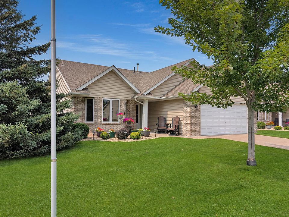 Welcome to a rare opportunity to enjoy maintenance free living in this true one level just blocks from the charm of Anoka's Main Street. As you enter, you'll be impressed with vaulted ceilings, an open floor plan, and a cozy fireplace framed by custom built-ins. The bright sunroom brings in natural light and opens to a peaceful patio, ideal for relaxing or entertaining. The spacious peninsula kitchen is designed for both daily functionality and special gatherings, with generous storage and plenty of counterspace. The primary suite boasts a full ensuite bath, with a separate tub and shower as well as a walk in closet. The second bedroom serves as an office, craft room or guest space. Storage is never an issue with amble closet space, the oversized 2 car garage and a pull down ladder leading to a finished storage space above the garage. Set on a beautifully landscaped corner lot, the property offers mature trees, green space views, a two-stall garage, and ample interior storage throughout. Residents enjoy access to a separate community center, complete with a kitchen available for private use at no cost. This location is walkable to restaurants and local shops, and is a short drive to freeway access, schools, churches, banks, and medical care. Right size into this amazing home and community!